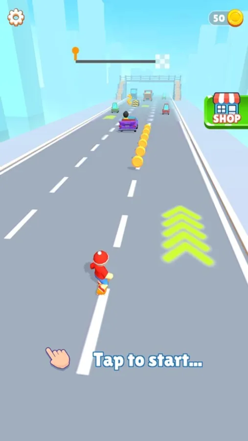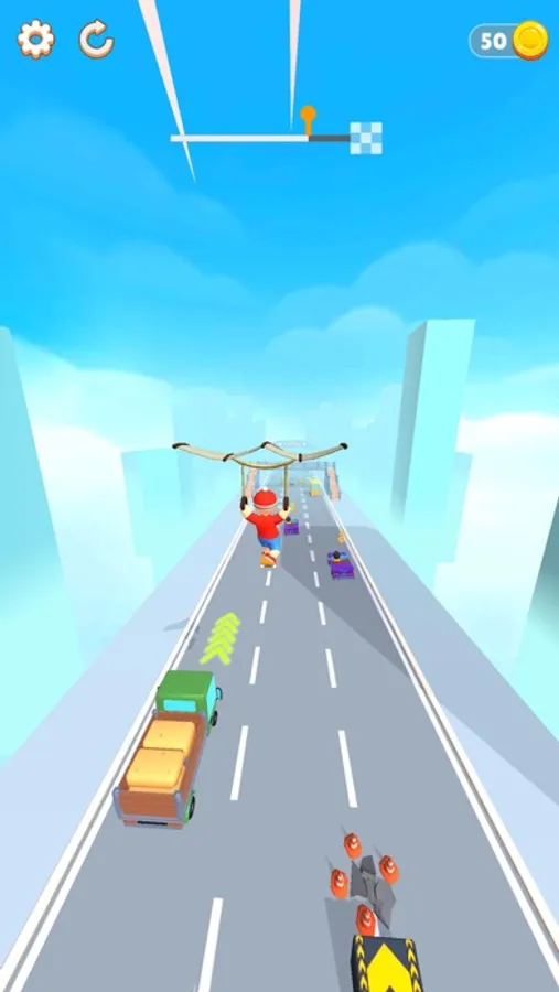 Throw your rope to get hooked to cars, signs or helicopters and jump from one to another to finish fast. Watch out for obstacles and traffic. Enjoy your super fast skate ride!