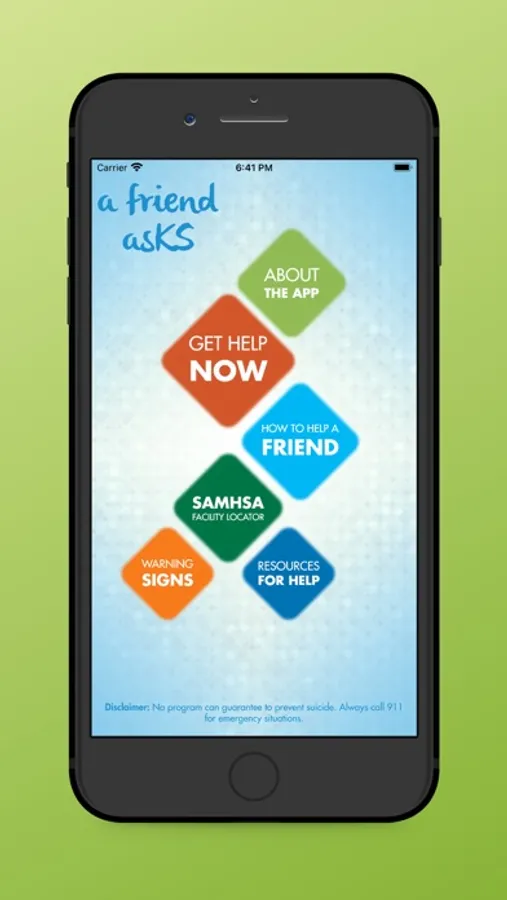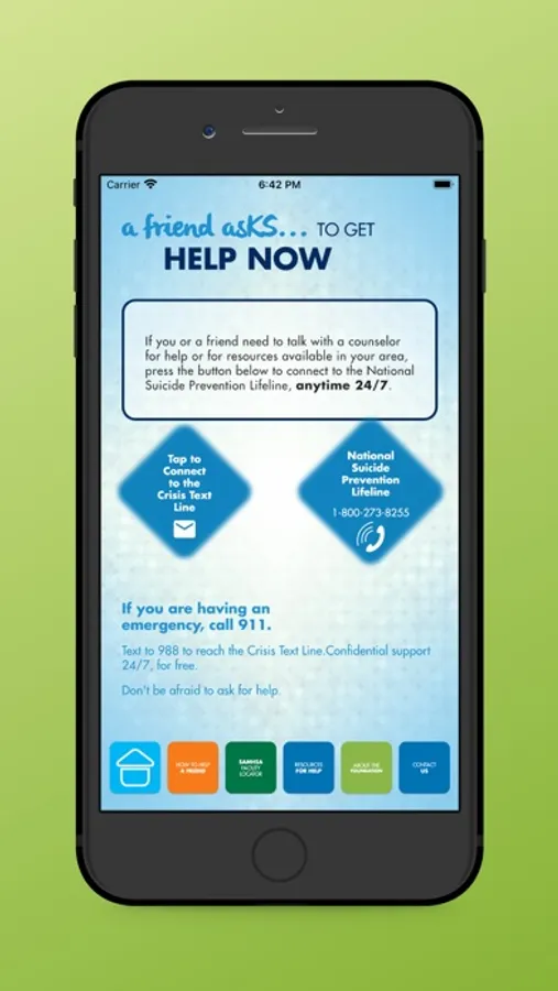 Would you know how to respond if you recognized your friend may be thinking about suicide? Here you will have access to the warning signs, do’s and don’ts, and the National Suicide Prevention Lifeline is a click away. Don’t be afraid to ask for help…for a friend or yourself. In an emergency, call 911 or visit your nearest emergency room. If you think a friend may be struggling, get professional help. Seek a doctor’s advice in addition to using this app and before making any medical decision.