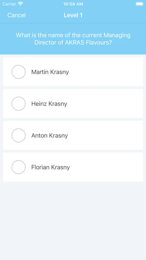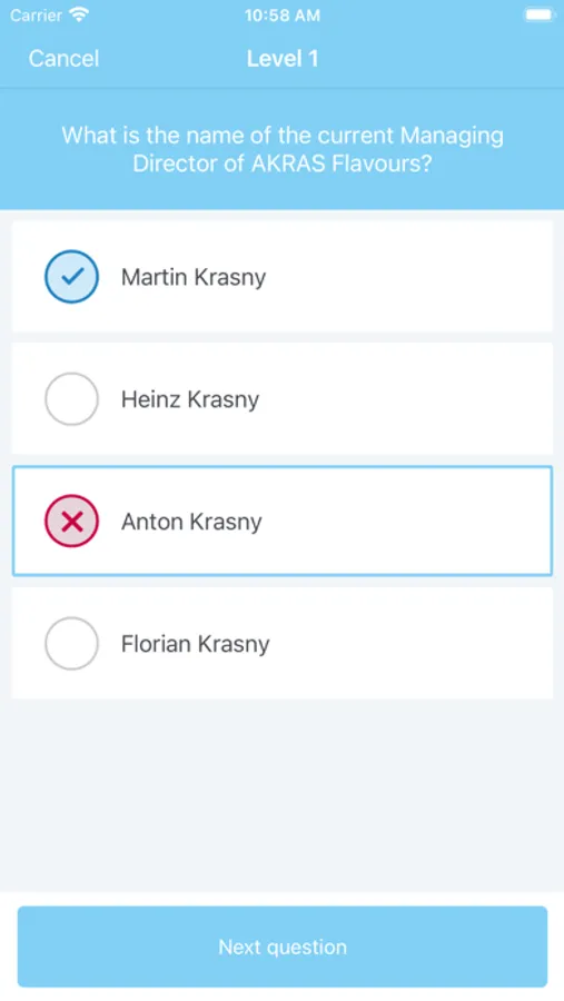 At AKRAS Flavours, corporate training should be combined with fun. The playful learning approach is implemented through the possibility of quiz duels. Colleagues, managers or even external partners can be challenged to a duel. This makes learning even more entertaining. The following game mode is possible: Three rounds of 3 questions each determine who is the king of knowledge.