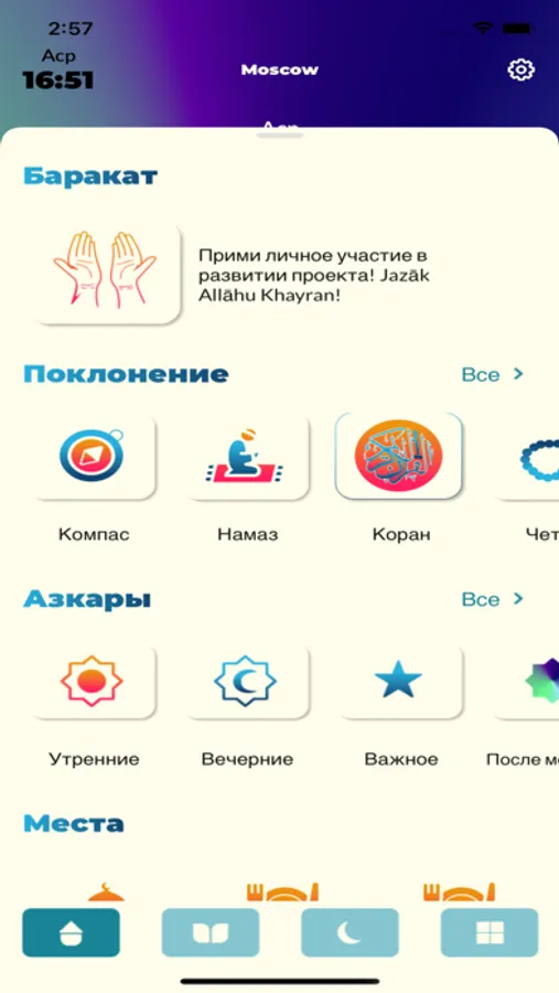 Muslim Life provides each user with the possibility of individual settings - you can change the functionality - connect services that you personally need and disable unnecessary ones.