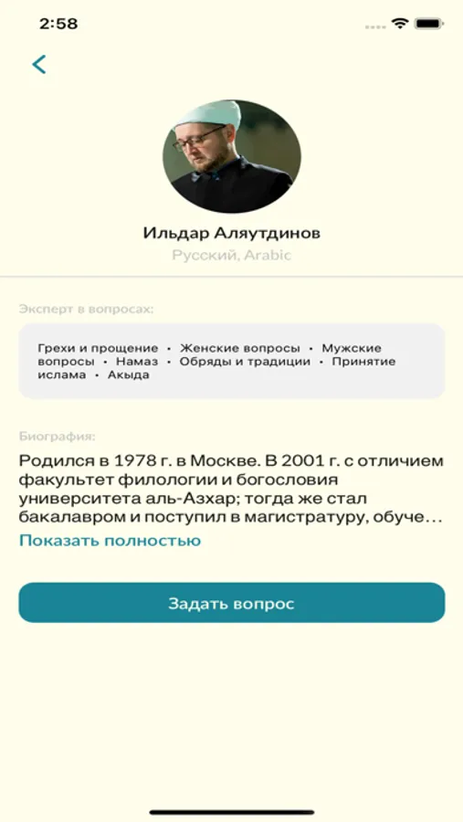 5. Islam. In the application, Muslims of both sexes and all ages can ask the Imam a question. Currently, experts are represented on the following issues: Namaz. Acceptance of Islam. Akida. Sins and forgiveness. Women's issues. Men's questions. Rites and traditions of Islam.
