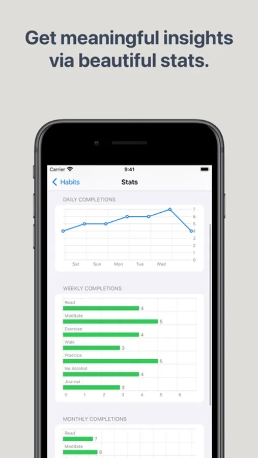 HabitBoard makes provides meaningful and beautiful stats that give an overview over all your tracked habits. You can inspect your overall weekly and monthly completions, get an overall completion rate, and keep track of your daily completions.
