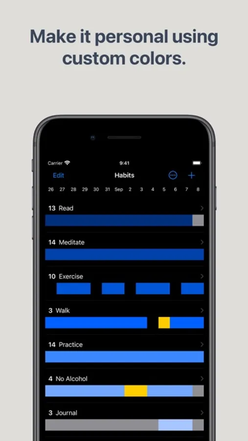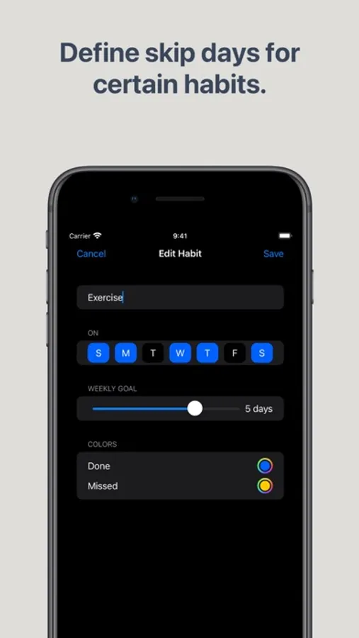 Each habit can use colors according to your personal taste or for visual grouping of habits. You can customize both the colors for done and missed habit states.