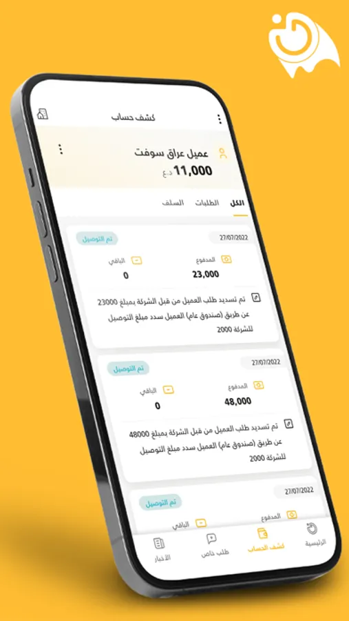 تطبيق خاص لأدارة طلبات التوصيل الخاصة بشركات الشحن يمكن استخدام النظام مع النظام المحاسبي المتكامل تبليغات واضافة ملاحظات على الطلبات والتحكم من قبل السائق والعميل وكشف حساب للتداولات المالية مع امكانية ارسال اخبار الى العملاء او السواق بالاضافة الى خصائص متعددة للنظام
