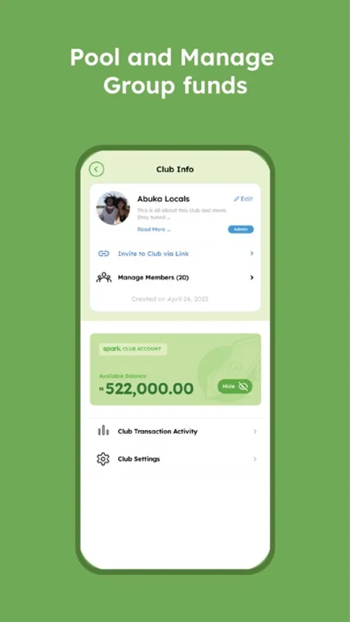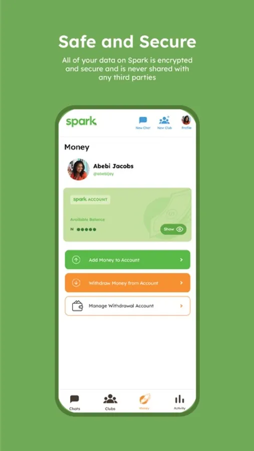 Invite others and create new P2P and Group Chats. We call Groups ‘Clubs’, and this is where Spark shines bright. Every Club comes with its own unique Club Account, to keep group finances separate and organised. Clubs have amazing settings that allow you to customise how social, private or transparent you'd like your Club activities to be. The tools Spark gives tend to promote greater trust and transparency and make collaboration for any community or business funds so much easier. We even give the option of adding ‘Approvers’ to the Club Account, so that no debits can happen without the other’s approval first – similar to adding co-signers to a digital joint account.