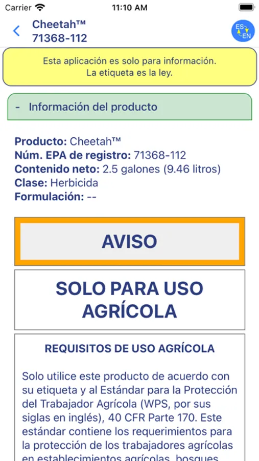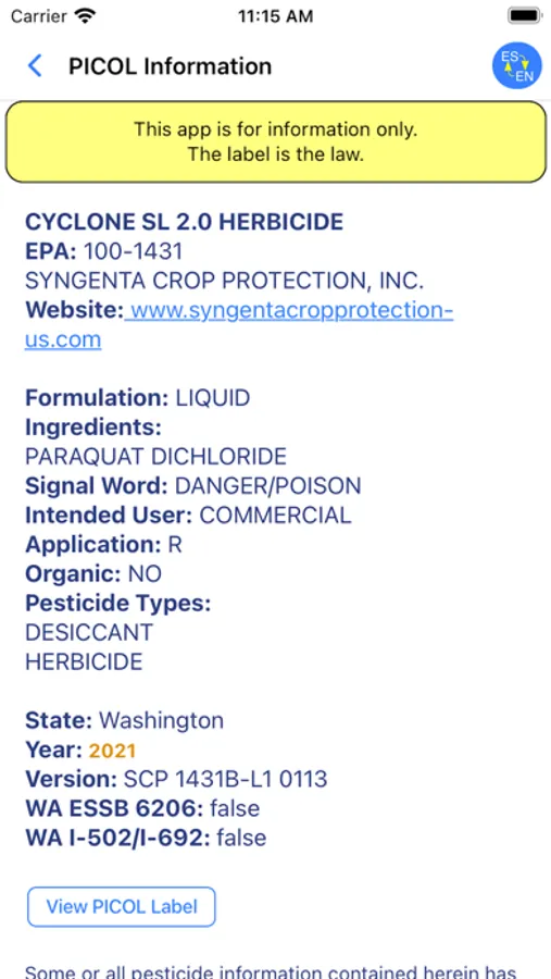 The app is for information and educational purposes only. It is not a substitute for obtaining and understanding the information on the pesticide labels. The information in this app has NO legal status. Remember THE LABEL IS THE LAW.