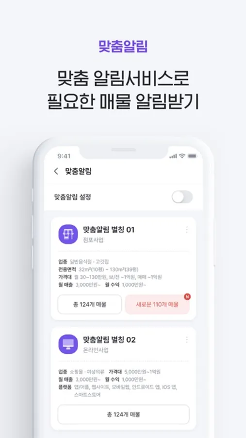 거래종류, 가격대, 면적, 검증여부 등 다양한 조건으로 나만의 맞춤 매물을 설정하여 신규 매물 등록 시 푸쉬 알림까지