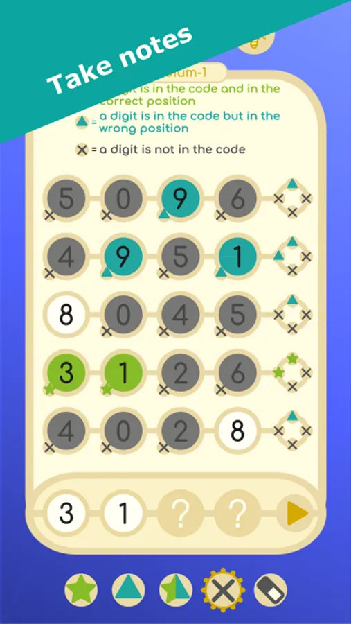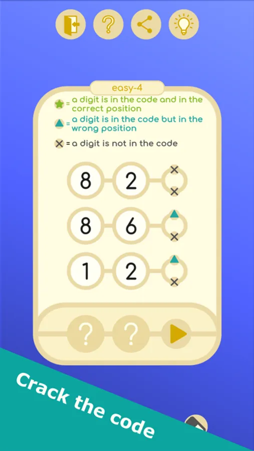 The game contains a quasi-infinite amount of puzzles, with the number of digits of the code ranging from 2 to 6. Three difficulty categories are provided, each with increasingly more challenging puzzles. You are free to play whichever difficulty you like most.