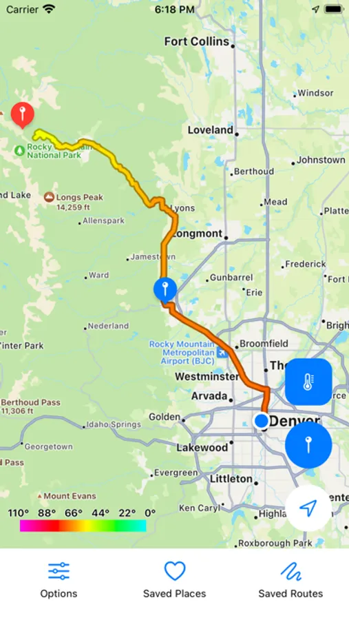 Color coded routes to represent the temperature, chance of precipitation, or wind speed.