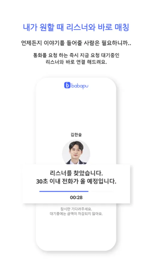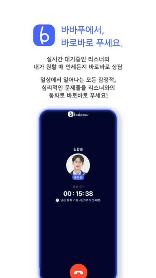 바바푸는 실시간 활동 중인 리스너(상담사)와 익명으로의 통화를 통해 공감과 위로를 받으며 바로바로 풀 수 있습니다.