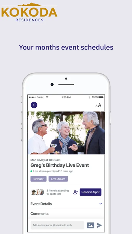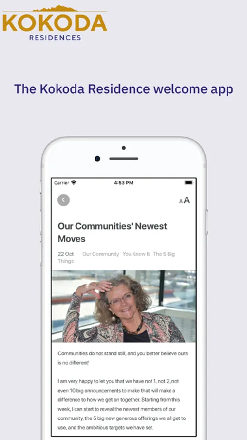 The App provides valuable information and up-to-date news directly to residents at Kokoda Residences in real-time. It also encourages residents to connect together and fosters community connection by enabling residents to book in to activities and events and view news and information relevant to the community. At any time residents are also able to access via the App important documents and resources relevant to life in Kokoda Residences and reach out to the team for support. It helps create a vibrant, digital resource for residents on their favourite devices and has been built to grow with and for the community at Kokoda Residences to create an exceptional living experience.