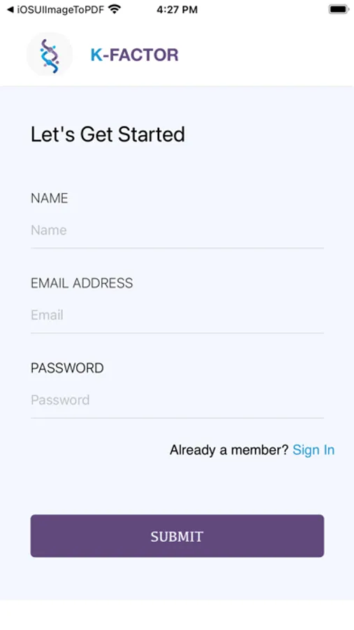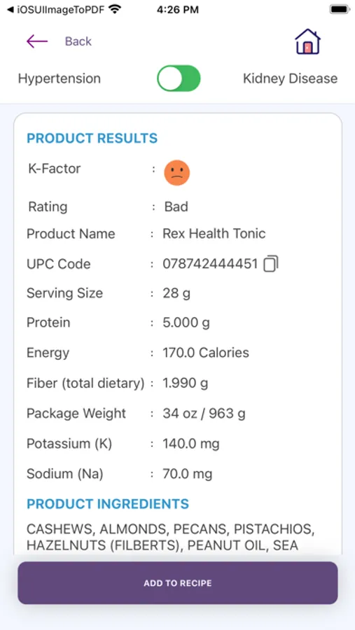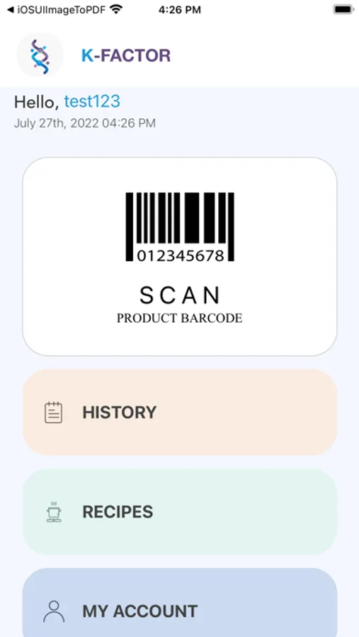 kFactor is an app that makes it easy for people to know the nutrient information in food items, specifically Sodium/Potassium, by simply scanning the bar code. Optionally, users can save history of the scanned food items, as well as create and save recipes.