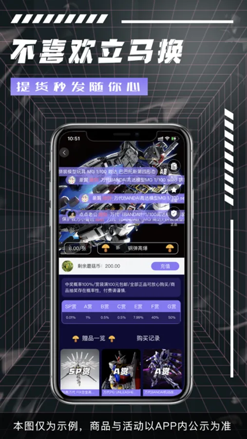 蘑菇赏是一款提供在线购买商品的平台,主要云集各类二次元相关的产品,从高达、潮玩、手办、盲盒等等,种类繁多,为用户提供玩具选择平台,购买方式以“赏”的形式抽选,提供多样化的选购,为用户选择心仪的商品。