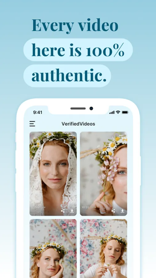Verified Videos is an app that allows users to authenticate their content online. Shoot your video within the app and certify your content with our watermark. Once you’ve got the watermark, post your video to your socials so that your followers know they follow the real you!