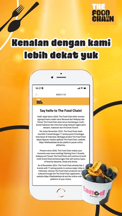 Hadir sejak tahun 2020, The Food Chain bikin momen ngumpul kamu makin seru! Berawal dari Keikpop dan Tanod, The Food Chain akan terus membangun multi-brand makanan dan minuman yang menjual ragam jenis dessert, makanan dan minuman favorit.