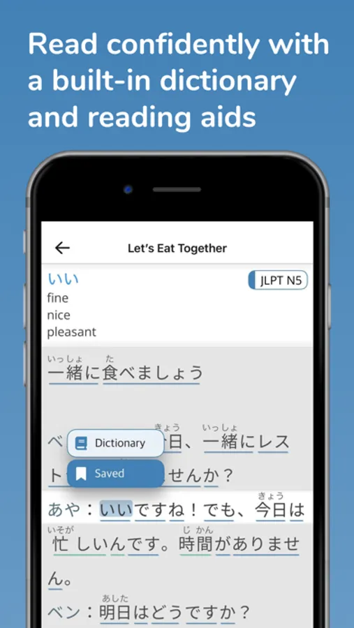 • Built-in dictionary with JLPT levels