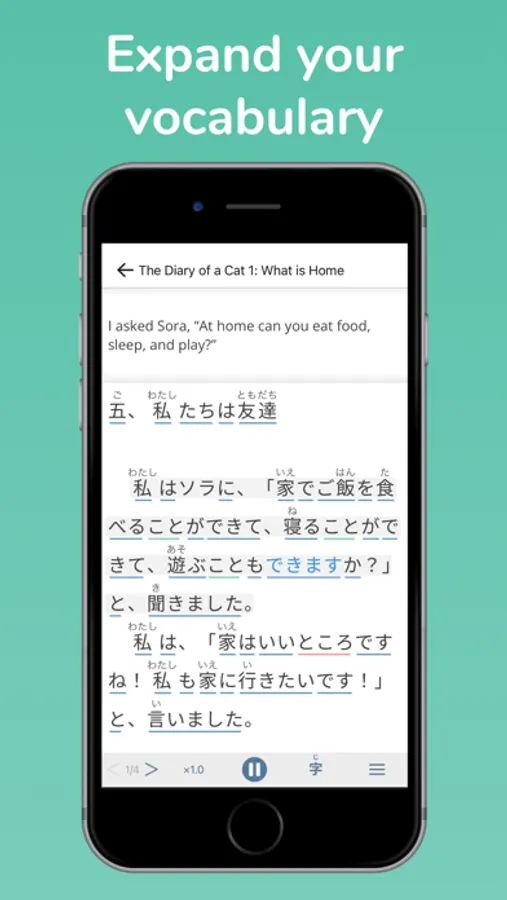 With Yomu Yomu, every reading is carefully written and translated by our language experts to help you improve your Japanese skills faster. We follow proven language learning methods to help you make real, lasting progress in your Japanese language skills. Dive deeper into your learning with our built-in dictionary and flashcards to reinforce your Japanese vocabulary.