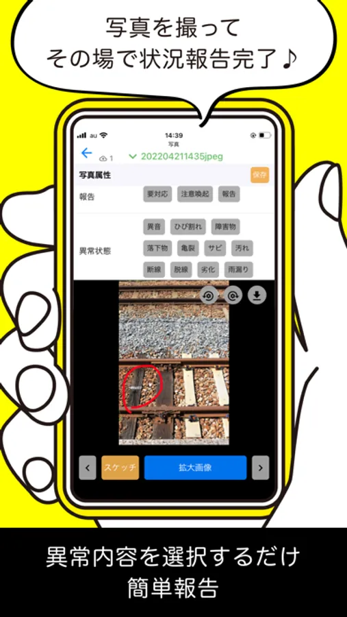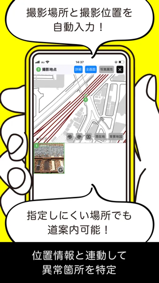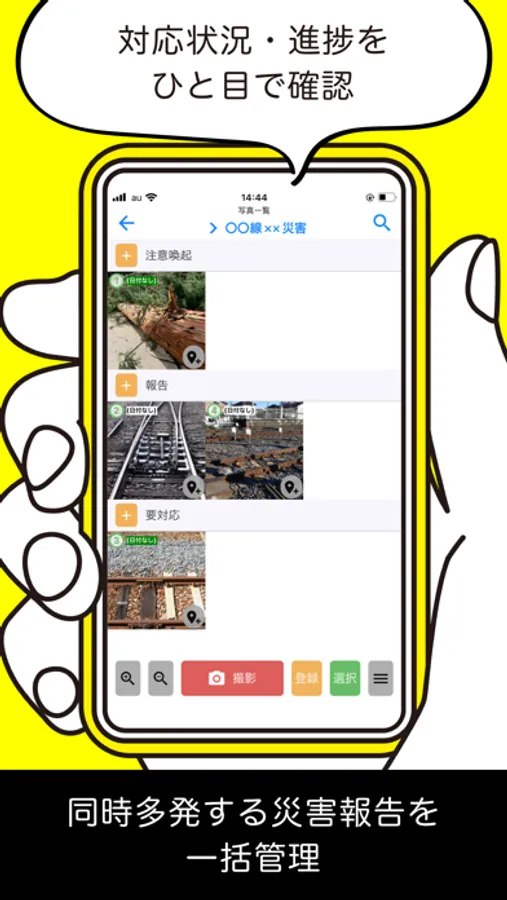 写真や動画の撮影、スケッチ追加、対応優先順位などのステータス入力、位置情報、撮影方位情報の付与、写真や動画の共有、共有範囲の設定、地図上での総括図表示