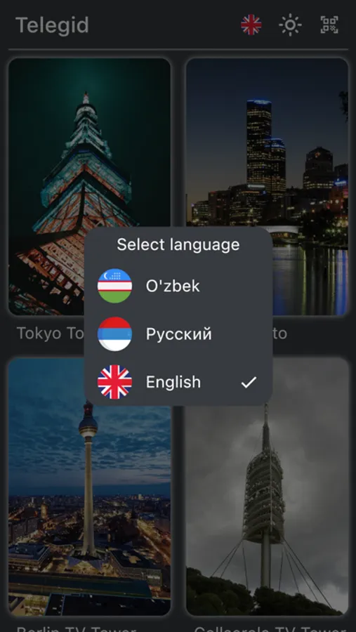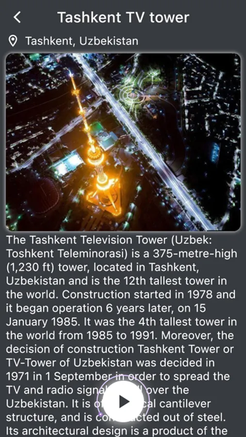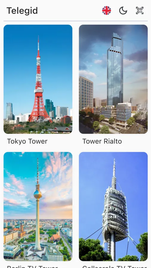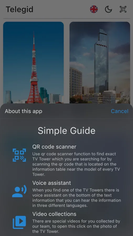 Use QR code scanner function to find text and voice information in three different languages or video about exact TV Tower which you are searching for by scanning the QR code that is located on the information table near the model of every TV Tower.