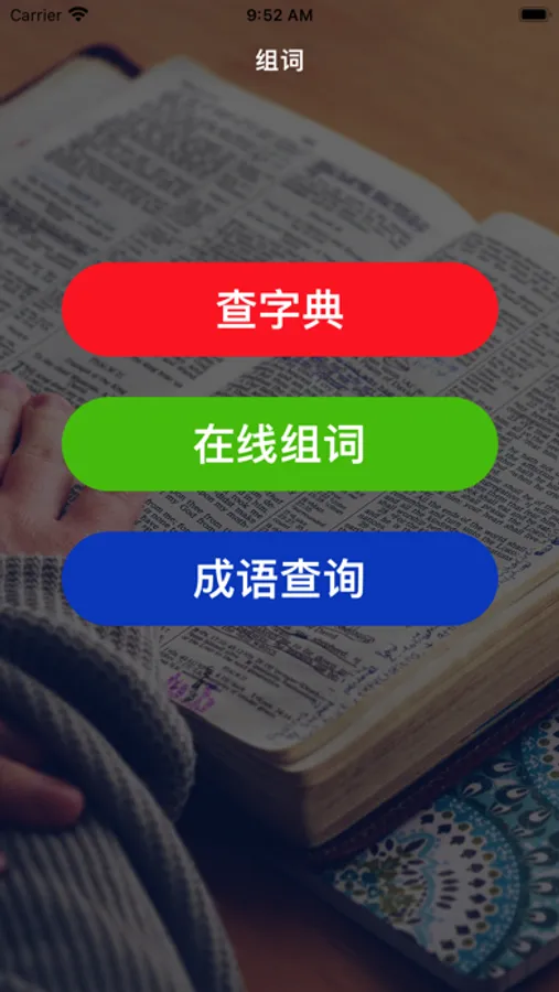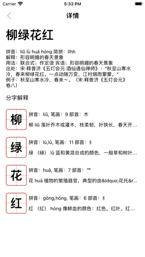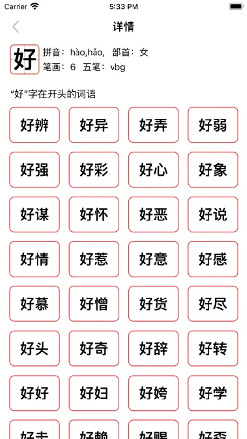 您可以在上述空格内输入汉字,例如:正 (注意,不要有空格) 然后按[组词],屏幕中会显示出有关[正]字词语,点击后就能得到解释。