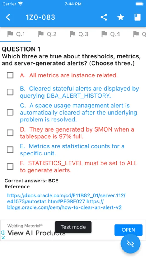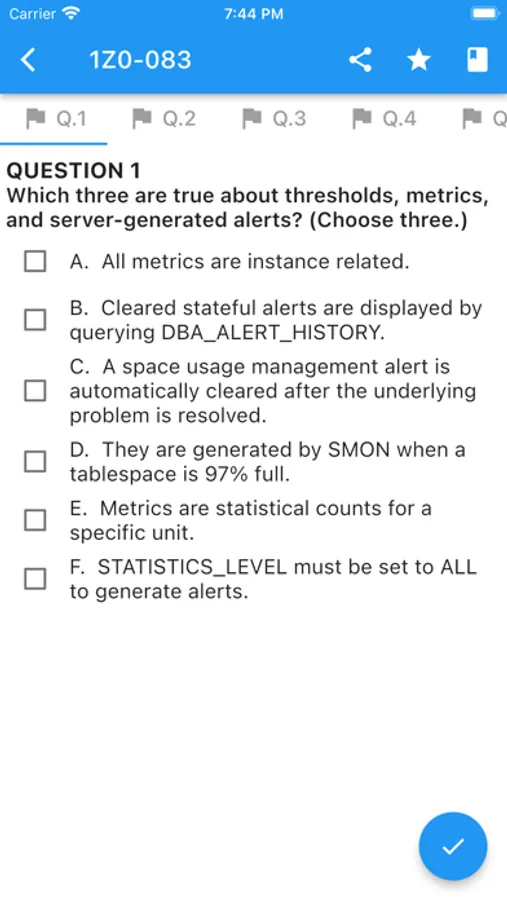 This app includes 152 questions to prepare for Oracle exam 01Z-083. The application allows you to study, mark important questions and automatically save the questions you have answered incorrectly so that you can easily check these questions again.