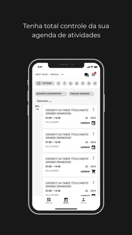 - Consulte a AGENDA de aulas: faça check-in, consulte horários, reserve lugar na sala e, se aula que você quer estiver lotada, seja notificado assim que tiver vaga disponível!