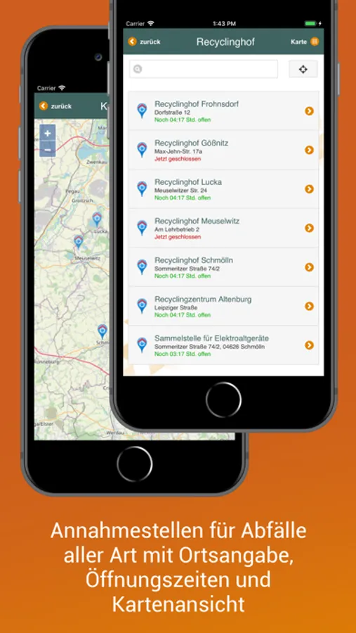 * Annahmestellen für Abfälle aller Art mit Ortsangabe und Öffnungszeiten, inkl. Kartenansicht und Navigation.