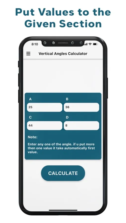 Give a try this Vertical Angles Calculator. Confidently write values into the app and find answers and save a lot of your time from the manual calculation of vertical angles.
