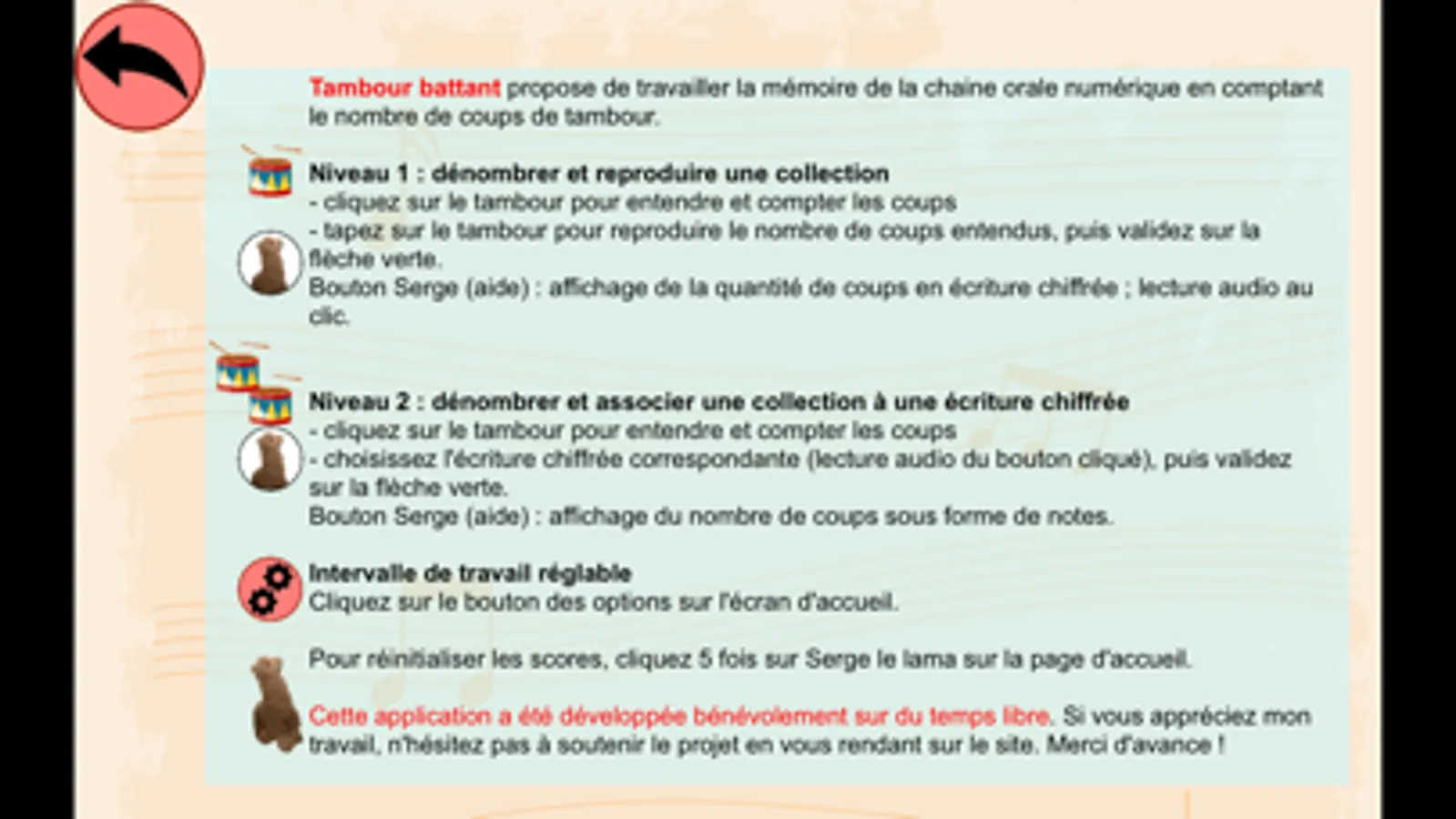 * Bouton Serge (aide) : affichage de la quantité de coups en écriture chiffrée ; lecture audio au clic.