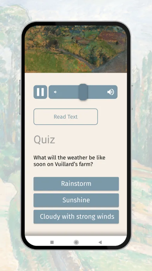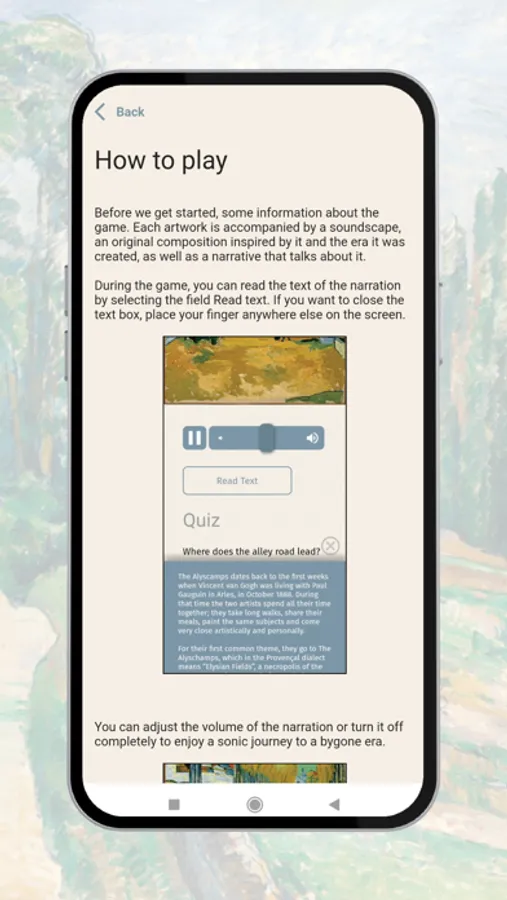 Each artwork is accompanied by a soundscape, an original composition inspired by it and the era it was created, as well as a narrative that talks about it. During the game, you can also read the text of the narration. In order to to move on to the next artwork you will have to answer a question, the