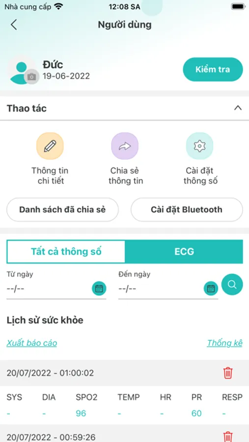 Với Globi, thông qua kết nối Bluetooth với Máy Theo Dõi Sức Khỏe bạn hoàn toàn có thể tự đo được các chỉ số sinh tồn của bản thân và người thân như: Nồng độ Oxi trong máu (SP02), Huyết áp (NIBP) , nhịp tim (HR), mạch đập (PR), nhịp hô hấp (RESP), nhiệt độ cơ thể (TEMP), điện tâm đồ ECG,.. một cách dễ dàng và nhanh chóng. Kết quả đo sẽ được hiển thị rõ ràng, đầy đủ trên màn hình điện thoại của bạn và lưu lại vào hồ sơ sức khỏe trên Vcould. Bạn hoàn toàn có thể xem lại những dữ liệu ngay trên chính điện thoại hoặc xuất ra để chia sẻ cho bác sỹ của mình khi cần thiết.