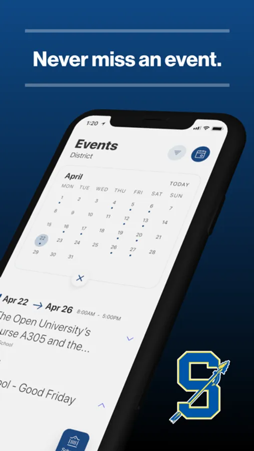 The event section shows a list of events throughout the district. Users can add an event to their calendar to share the event with friends and family with one tap.