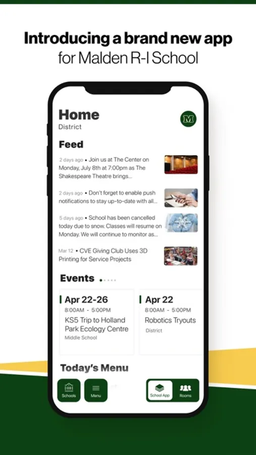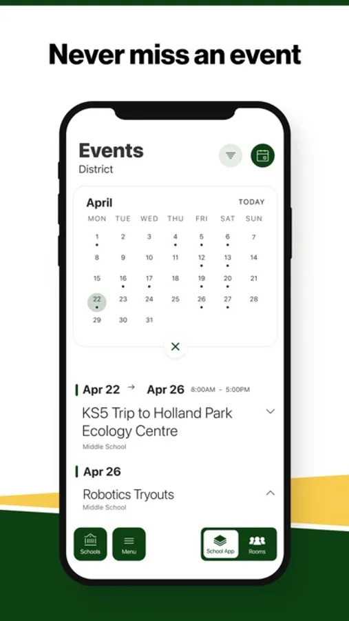 The event section shows a list of events throughout the district. Users can add an event to their calendar to share the event with friends and family with one tap.