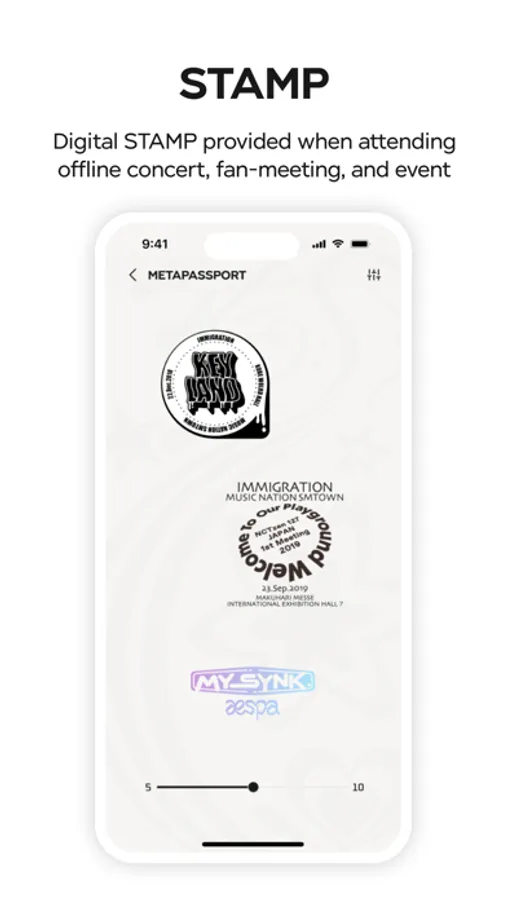With MUSIC NATION SMTOWN META-PASSPORT, you can collect STAMP from every on&offline event held by SM Group, and also keep your Fanclub information with the activities as a MUSIC NATION SMTOWN’s citizen more easily.