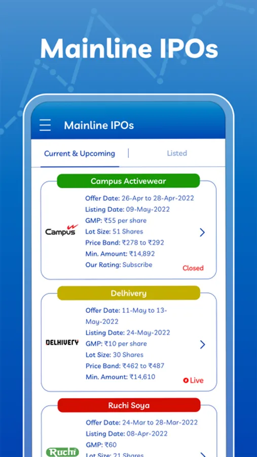 1. Mainline IPO, which is a normal type of IPO where every investor can invest with small investment amount which is near around fifteen thousand. Mainline IPO section will provide Live / Upcoming / Listed categorized IPO List.