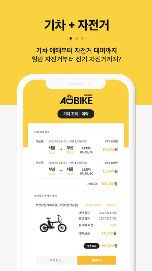날짜와 출/도착역 검색 후 좌석 선택이 진행되며 이 후 대여 자전거 선택이 진행됩니다.