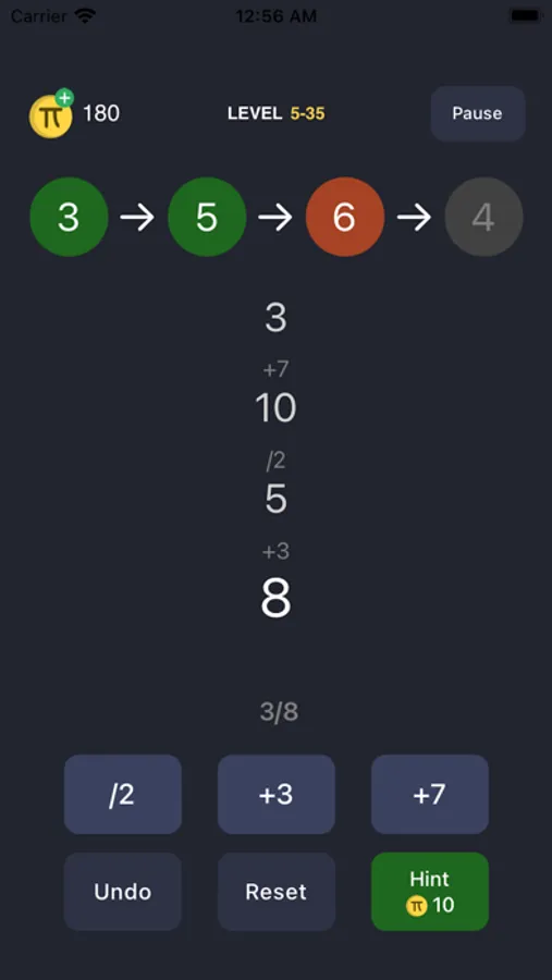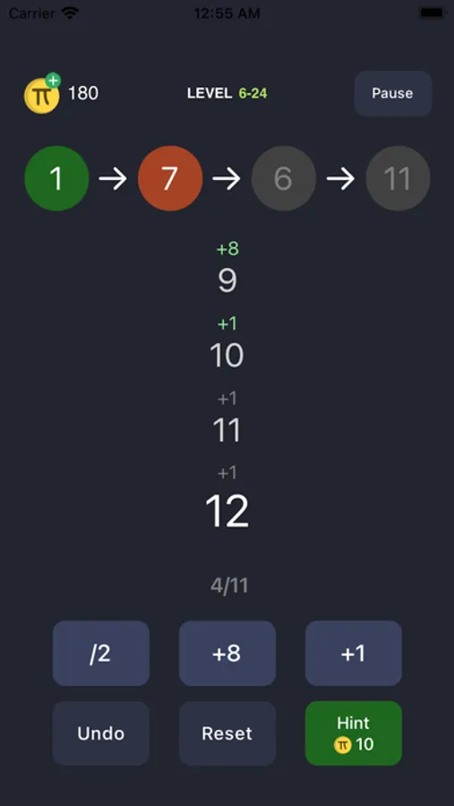 As the difficulty increases, new operations are added. Starting with addition and subtraction and solutions that are under ten steps in the easy levels, the hardest levels include square roots and up to nineteen steps!