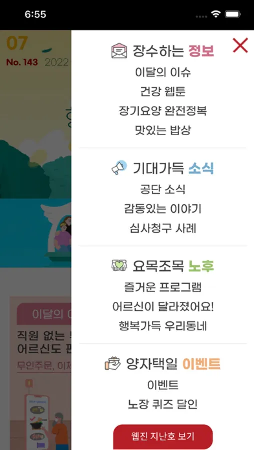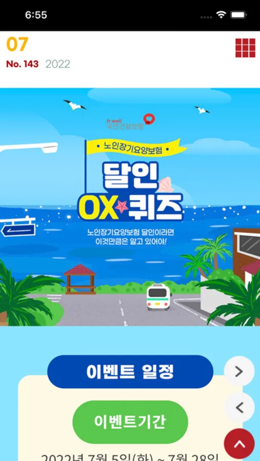 장기요양웹진을 통해 실생활에 꼭 필요한 건강 정보와 국민건강보험공단과 관련된 소식, 요양보호사 등 장기요양종사자의 전문적인 어르신 돌봄 노하우 등을 확인하실 수 있으며, 매월 새롭게 진행되는 다양한 이벤트에도 참여하실 수 있습니다.
