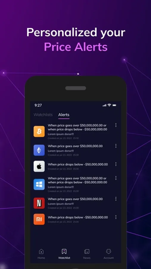 Personalise your favourite cryptos into a list and keep track of all your stocks and currency pairs in real-time. Monitor current price updates and be the first to know the market movements at any time, anywhere.