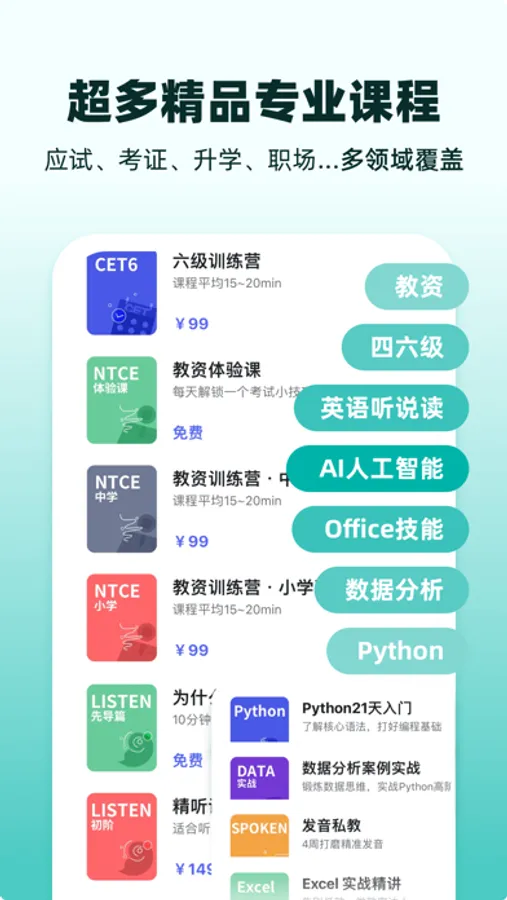 扇贝课堂致力于为18岁以上用户提供一站式学习平台。围绕四六级考试、考研考试、职场技能提升、教资考证,提供扇贝自主研发的精品课程。结合富有特色的授课形式、学习测评、实操练习、考试规划,你可以只管努力,剩下的请交给我们!