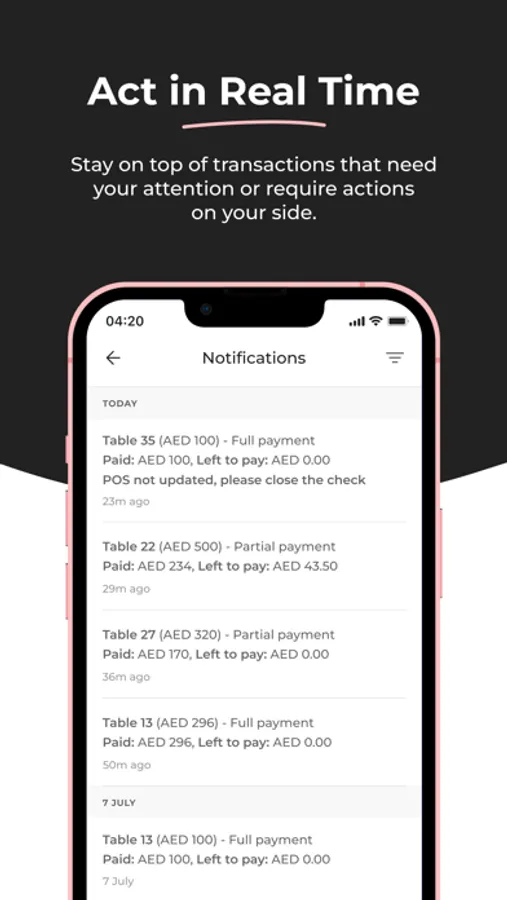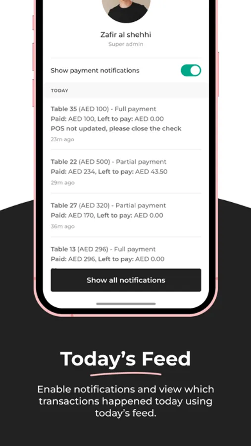 Enable push notifications of transactions to see what´s happening at your tables instantly.