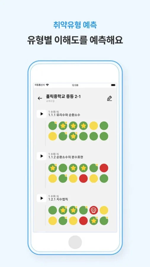 학습 데이터를 분석해 아직 풀지 않은 유형의 이해도를 예측해요. 문제를 풀기 전에 어떤 유형이 취약한지 미리 알고 효과적으로 학습할 수 있어요.