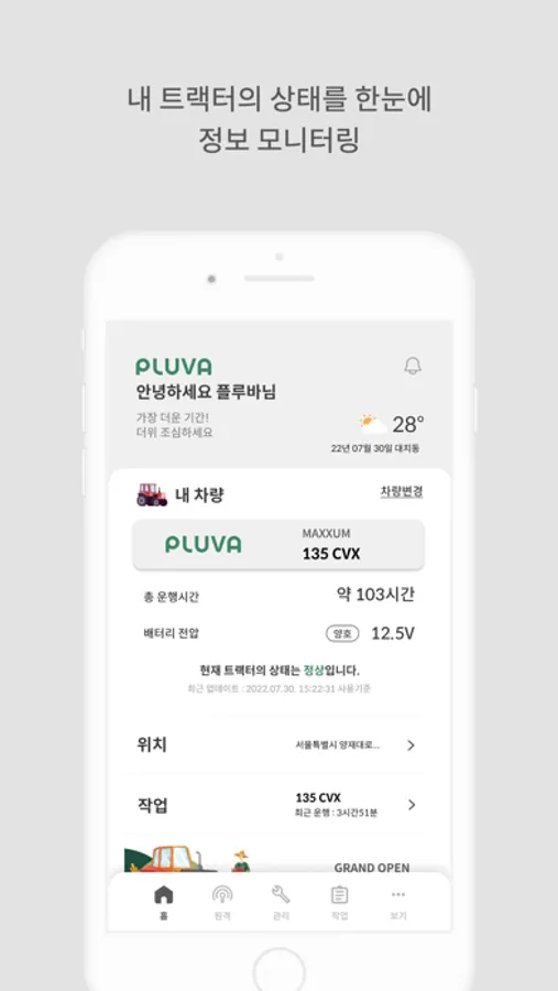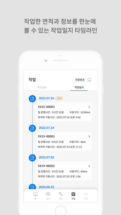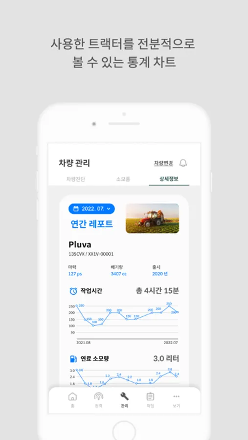 작업일지를 제공하여 연비 등 유용한 정보들을 실시간으로 확인할 수 있으며, 차량 전복 사고가 발생하면 자동으로 SOS 알림을 보내드립니다.