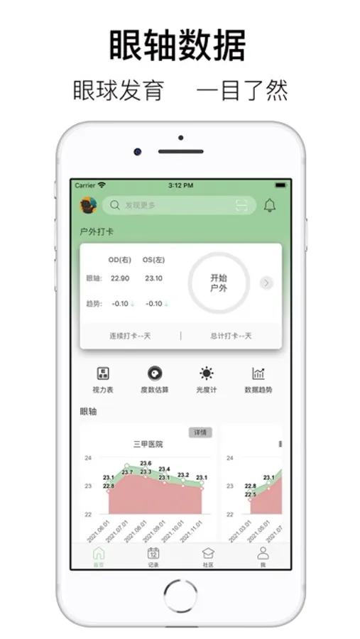 【眼记】是一款保管视力检查单并会生成对应的眼轴折线,并提供社区功能构建近视家长的交流社区。同时包含户外打卡、视力表和光度计等实用小工具。