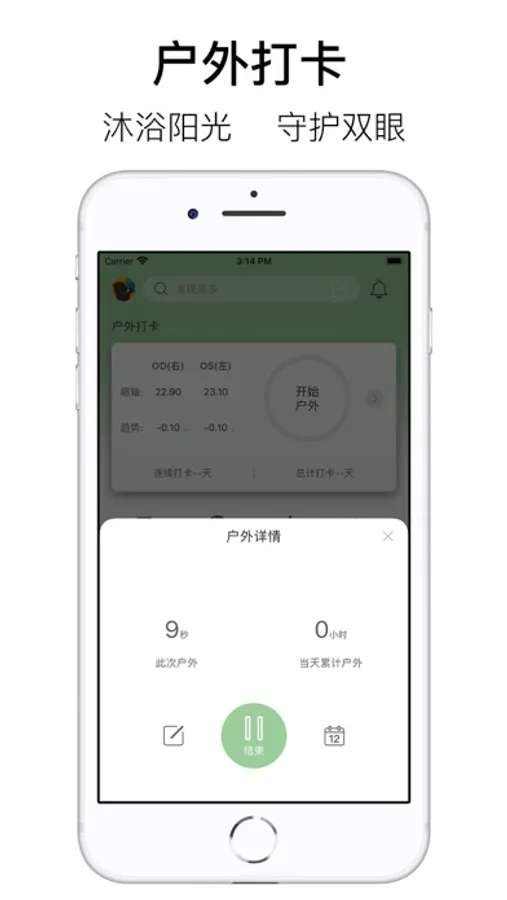 让双眼沐浴在阳光中,看蓝天白云,赏飞鸟云雀,望绿树小草,享清风拂面......每天记录户外打卡时间,让眼睛得到充足的养分与充分的休息,有效防控近视。