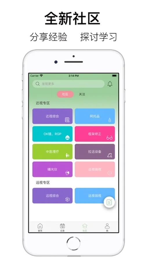 社区板块包括近视专区和远视专区,可以分享查阅关于OK镜、阿托品、哺光仪、拉远设备等相关资料,共同探讨有效的防控手段。