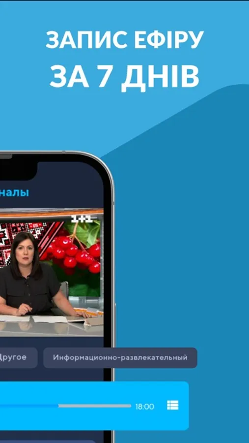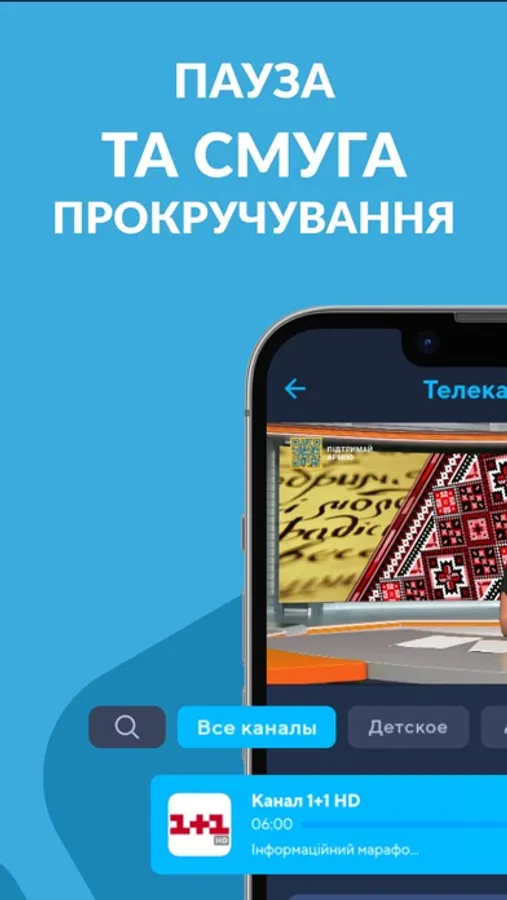 Керуйте переглядом — ставте ефір на паузу та вмикайте його пізніше. Є смуга прокручування для перемотки та перегляду з початку. Дивіться улюблені передачі у свій зручний час, не прив'язуючись до телепрограми. Запис ефіру зберігається 7 днів.
