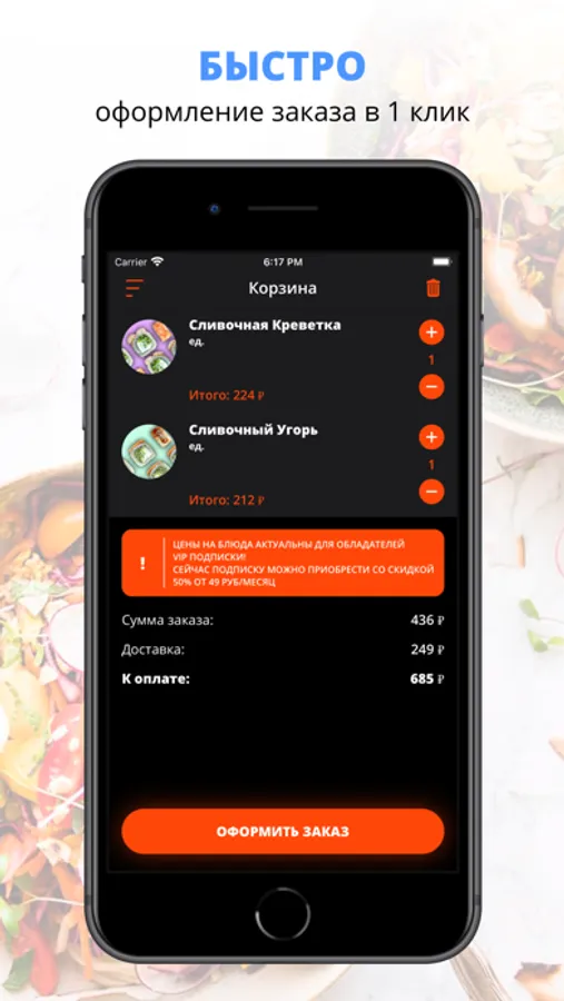 Скачивайте наше приложение, оформляйте заказ и наслаждайтесь любимой едой, где бы Вы ни были! Приятного аппетита!