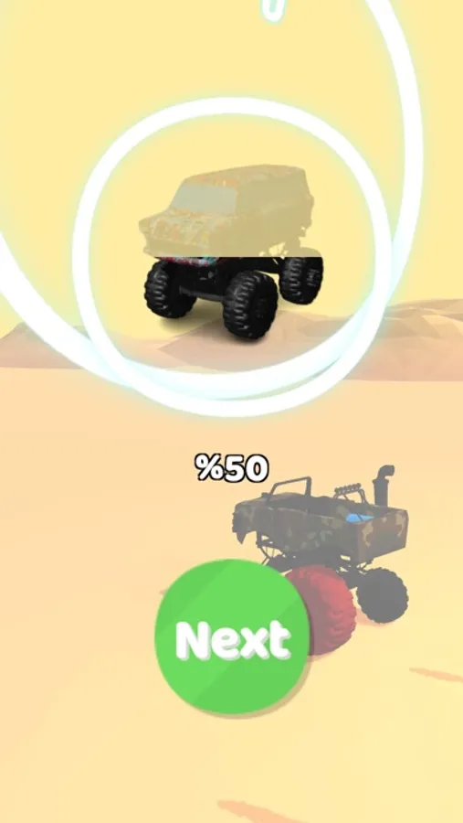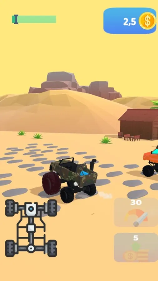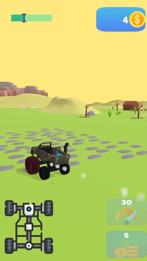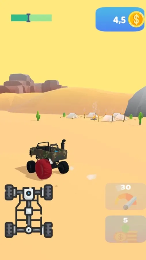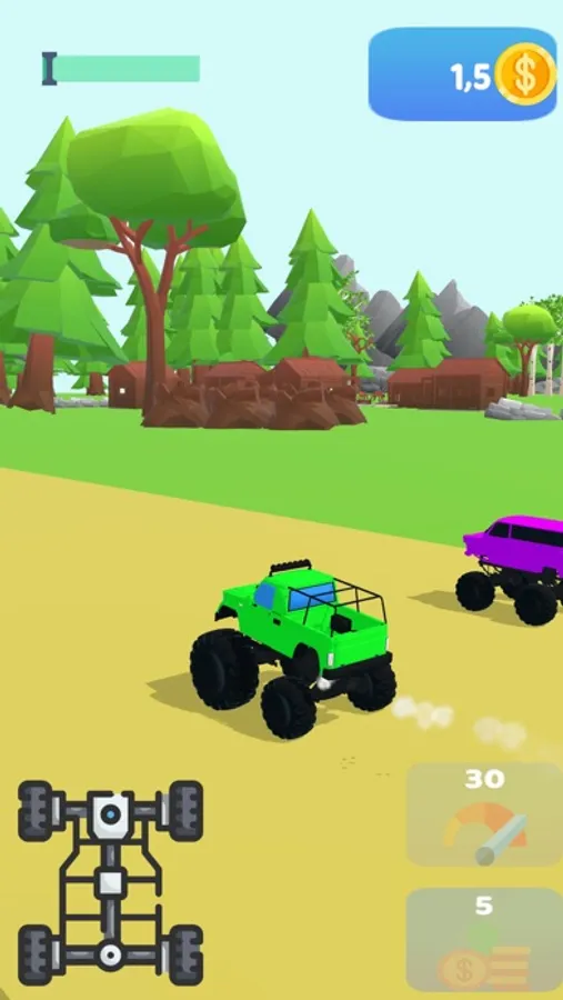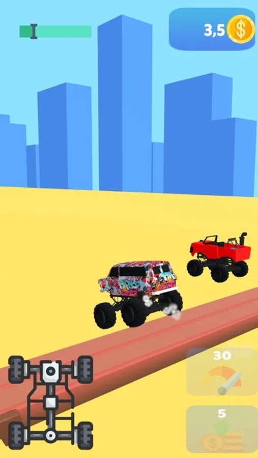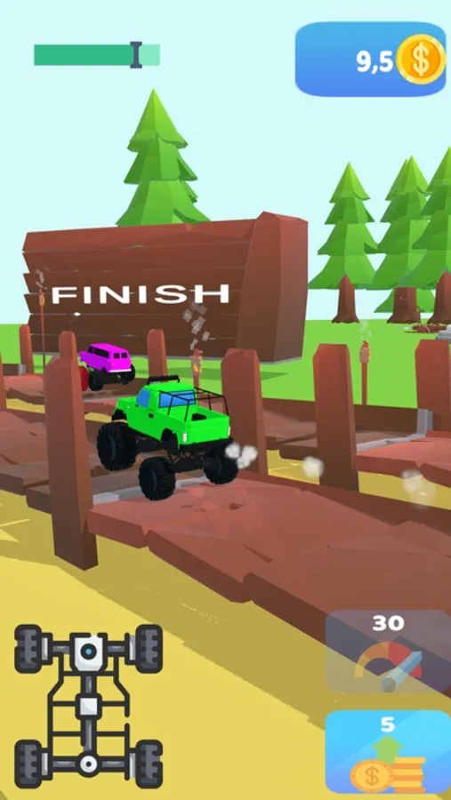 Our monster truck aims to reach the finish line by inflating its tires and quickly dodge the obstacles in front of it!