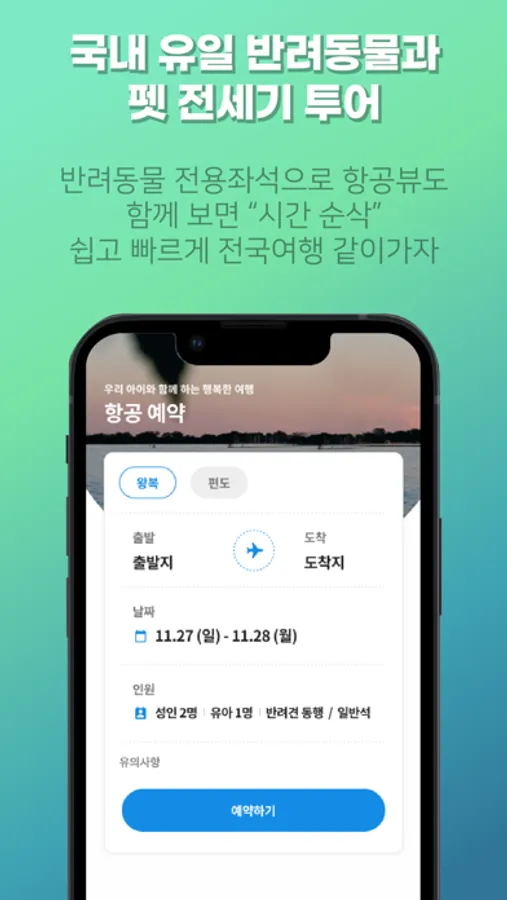 제주, 무안, 사천, 울산 등 지역의 명소를 반려동물 전용좌석으로 항공뷰도 함께 보면 “시간 순삭” ! 이제 우리 아이와 쉽고 편하고 빠르게 여행을 다녀 보세요. 펫 전세기 예약 뿐 아니라 펫팸들과 함께 떠나는 펫팸 패키지 여행으로, 댕댕이들과 단체로 비행기도 타고 지역의 관광 명소에서 함께 쉬고, 먹고, 즐기는 투어도 만나보세요.